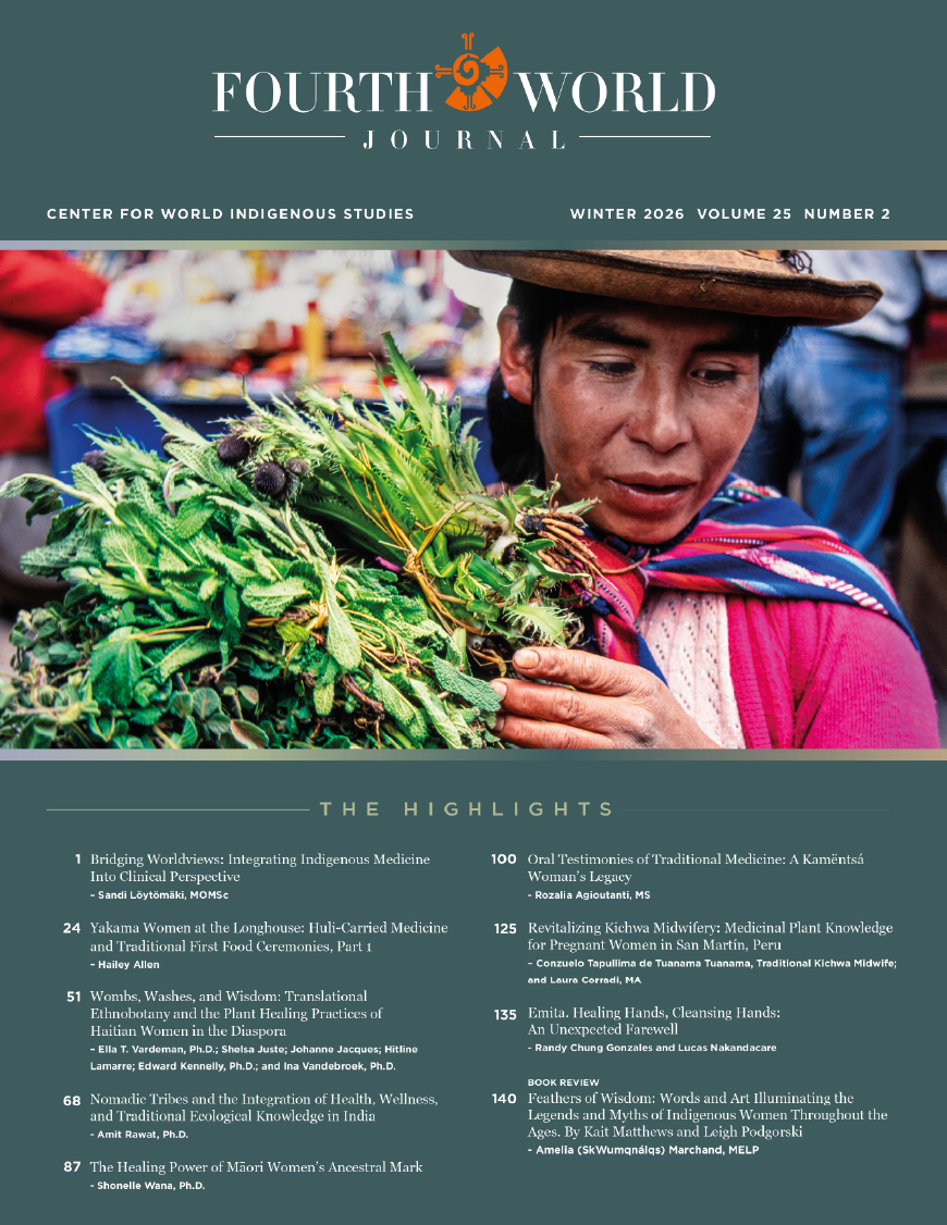 This special issue of The Fourth World Journal is devoted to women’s traditional medicine as a vital source of knowledge, practice, and resistance. Bringing together healers, activists, scholars, and artists from across global Indigenous and diasporic contexts, this issue’s focus challenges dominant frameworks of health by foregrounding cultural, relational, and place-based experiences of health and healing. We read academic analysis, narrative, and creative expression, presented by a wide range of voices, practices, and geographies, that illustrate how women sustain and adapt healing traditions. Each contributor identifies the diverse ways in which Indigenous epistemologies arise from a sense of place and belonging, often rooted in ancient traditions, and how this commonality shapes research and decision-making relevant today. From this perspective, traditional health and healing arise from culture and lived experience, while recognizing that the enduring effects of colonization shape traditional health care practices today.